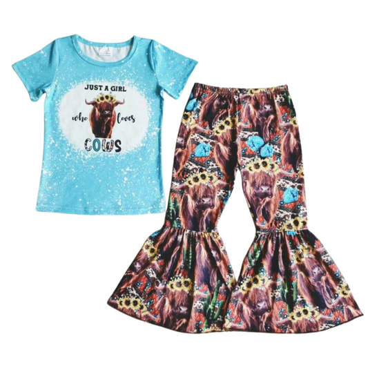 Girl Loves Cow Sunflowers - Western Bell Bottom Outfit Kids