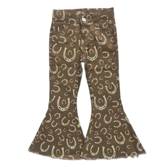 Girls Bell Bottom Denim Pants - Western Brown Horseshoe Kids