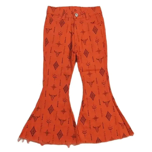 Girls Bell Bottom Denim Pants - Western Orange Steer Skull