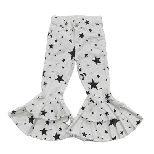 Girls Bell Bottom Denim Pants - Western White Black Star