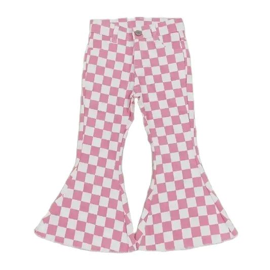 Girls Bell Bottom Denim Pants Western Pink Checkerboard Kids