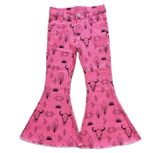 Girls Bell Bottom Denim Pants -Western Pink Steer Skull Kids