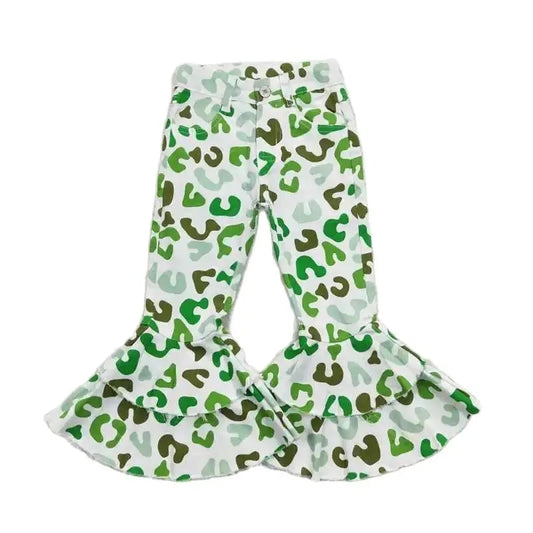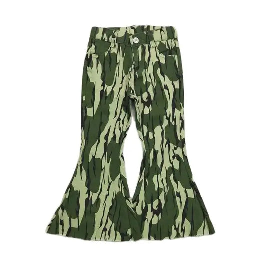 Girls Bell Bottom Denim Pants - Western Green Camo Kids