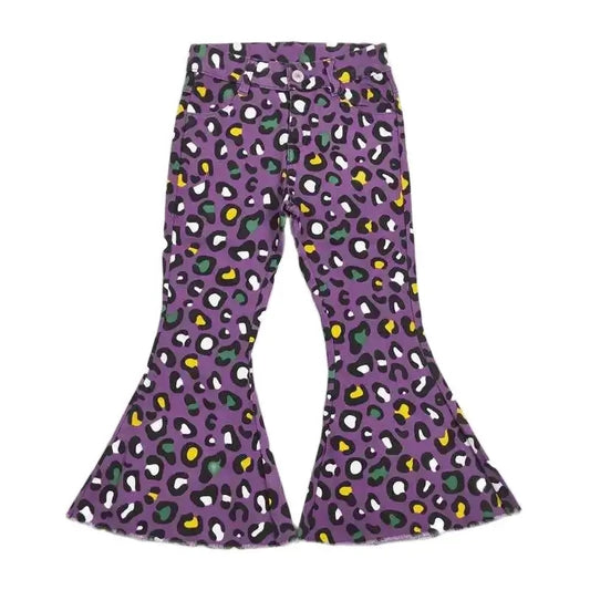 Girls Bell Bottom Denim Pants - Western Purple Leopard Kids