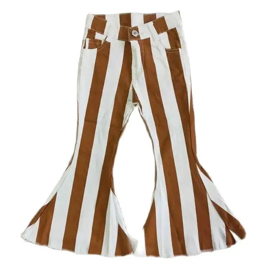 Girls Bell Bottom Denim Pants - Western Brown Stripe Kids