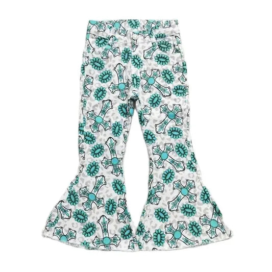 Girls Bell Bottom Denim Pants - Western Turquoise Cross Kids