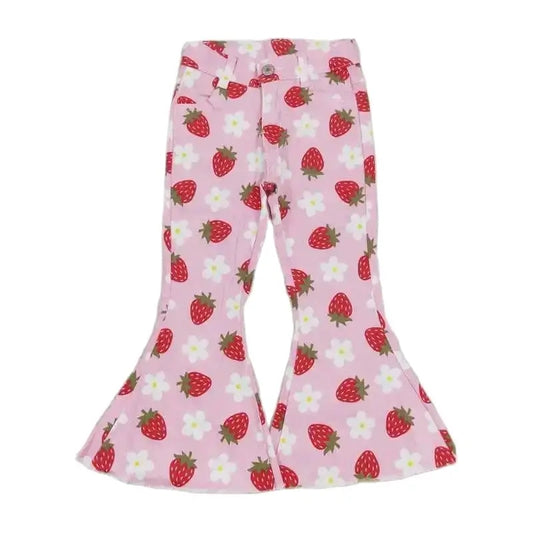 Girls Bell Bottom Denim Pants - Western Pink Strawberry Kids