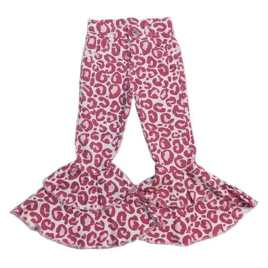 Girls Bell Bottom Denim Pants - Western Pink Leopard Print