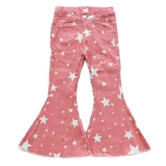 Girls Bell Bottom Denim Pants - Western Pink White Star Kids