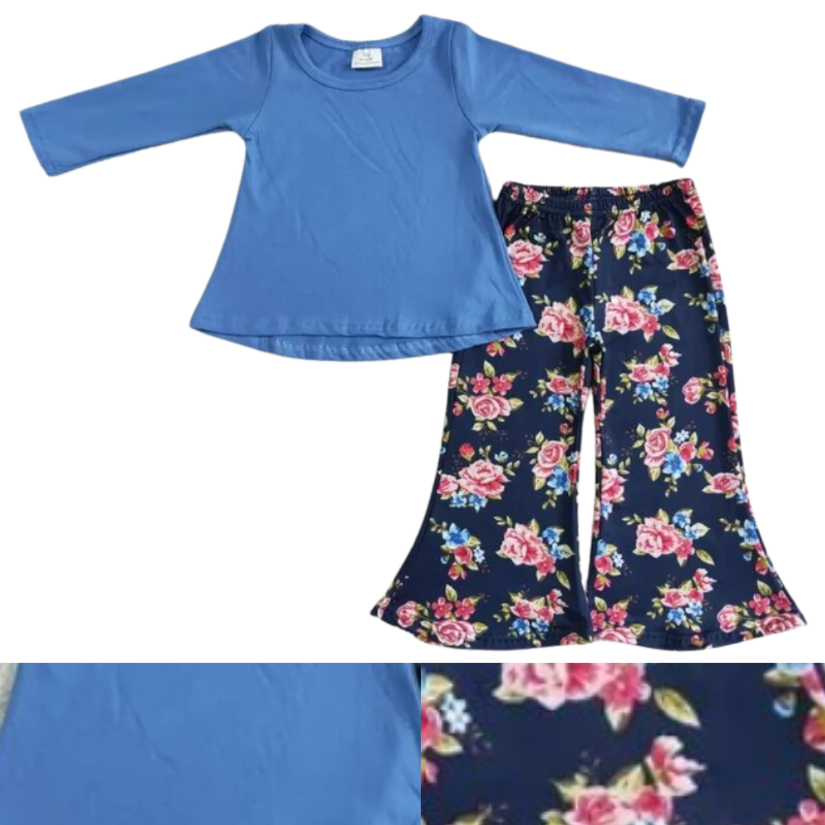 Floral Pants & Long Sleeve Solid Blue Shirt Autumn