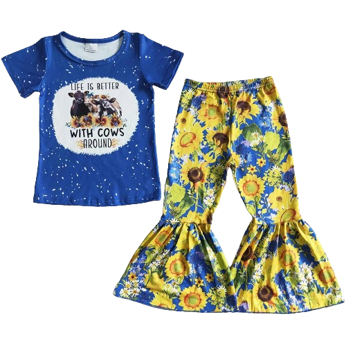 Blue Sunflower Cow -Western Bell Bottom Outfit Kids Clothing