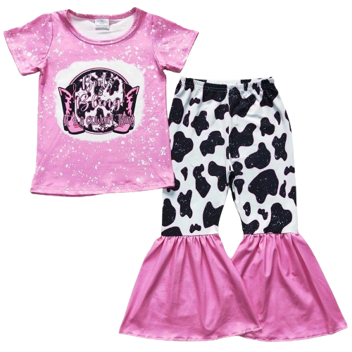 Get ready for versatile style with our short sleeve shirt and pants outfits, designed to breeze through seasonal transitions with ease! These must-have ensembles are not only the best-selling silhouette but also perfect for keeping your little ones stylish and comfortable all year round. Crafted from premium fabrics, they offer unbeatable value and are sure to become go-to favorites in any wardrobe. Immerse your little adventurers in Western / Southwest / Southwestern children's style with our charming outfits and dresses, featuring Southwestern classics such as cactus motifs, cowboy hats, and adorable farm animal prints like horses, pigs, and cows. One can never have enough cow print! Let their personalities shine in bell bottoms with vibrant serape stripes or embrace the boho vibe with geometric prints that add a whimsical touch. Sprinkle in the sunny charm of sunflowers for a delightful ensemble that captures the essence of the Southwest in every detail! Keywords you may be looking for: Boots Bling Cowgirl Thing, Bell Bottoms, Bell Bottom Pants, Flares, Flare Pants, Milk silk, Stretchy, Comfy, Western, Southwest Style, .