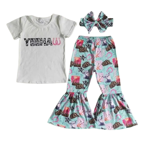 Get ready for versatile style with our short sleeve shirt and pants outfits, designed to breeze through seasonal transitions with ease! These must-have ensembles are not only the best-selling silhouette but also perfect for keeping your little ones stylish and comfortable all year round. Crafted from premium fabrics, they offer unbeatable value and are sure to become go-to favorites in any wardrobe. Immerse your little adventurers in Southwestern children's style with our charming outfits and dresses, featuring Southwestern classics such as cactus motifs, cowboy hats, and adorable farm animal prints like horses, pigs, and cows. One can never have enough cow print! Let their personalities shine in bell bottoms with vibrant serape stripes or embrace the boho vibe with geometric prints that add a whimsical touch. Sprinkle in the sunny charm of sunflowers for a delightful ensemble that captures the essence of the Southwest in every detail! Keywords you may be looking for: Yeehaw Bougie Cowgirl, Bell Bottoms, Flare Pants, Stars, Western. Western Apparel, Baby Clothing, Baby Clothes, Kids Clothing, Kids Clothes